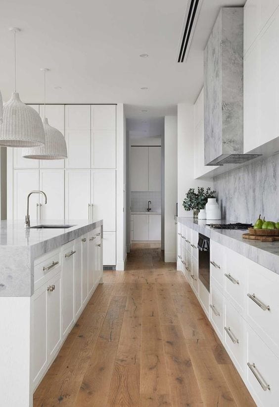 A gallery kitchen is a functional solution for designing a narrow kitchen or making an impact. A gallery kitchen is defined by two rows that face each other with a walkway in between. The benefits of a galley kitchen are great when space is limited and provides additional benefits in storage space and practicality. If you have ample space, you can opt to have a freestanding island bench in the middle of the walkway between the two rows.