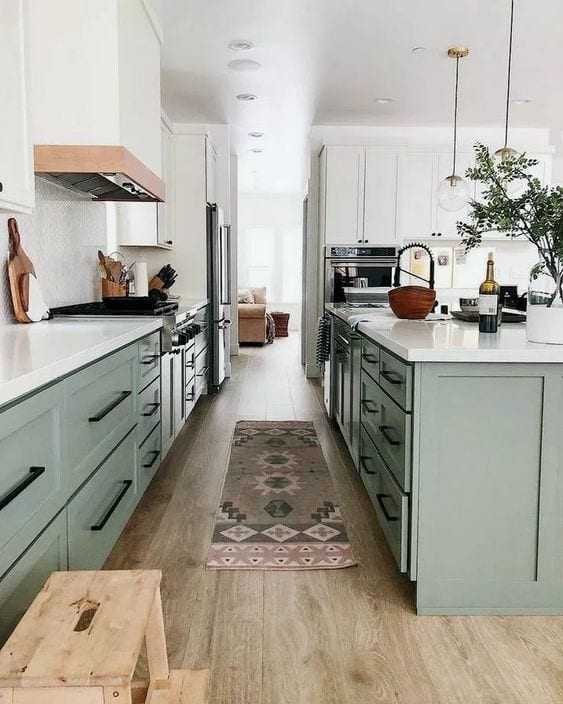 A gallery kitchen is a functional solution for designing a narrow kitchen or making an impact. A gallery kitchen is defined by two rows that face each other with a walkway in between. The benefits of a galley kitchen are great when space is limited and provides additional benefits in storage space and practicality. If you have ample space, you can opt to have a freestanding island bench in the middle of the walkway between the two rows.