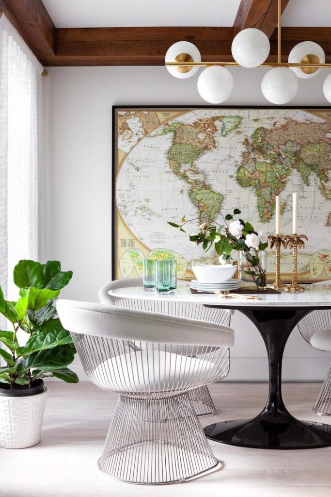It wasn’t just the kitchen that received a much-needed upgrade during Karin Bohn’s renovation. Throughout her home, Bohn introduced bold design elements that reflect her personality and life experiences. In the dining room, she added a world map to the floor as a tribute to the many years of globetrotting she’s enjoyed with her husband.