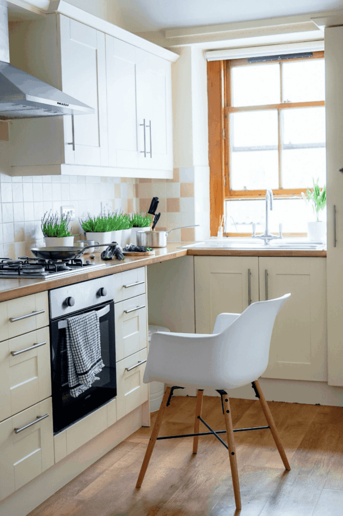 With lots of natural light and neutral colours, this kitchen maximises a small space. Green plants add a touch of colour, and the white chair shows how the space can be used for cooking, dining, and washing.